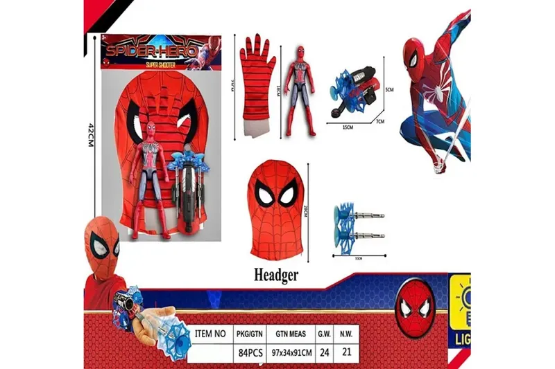Герої Спайдермен BB1055 - Перед замовленням, будь ласка, уточнюйте наявність (оптовий склад). Ігровий набір супергероя "Спайдермен" BB1055 - це комплект, що включає фігурку Людини-павука (18 см) зі світловими ефектами. У набір також входять маска, рукавичка та пусковий механізм, що стріляє 3 снарядами на присосках. Набір упакований у пакет розміром см і призначений для сюжетно-рольових ігор. Основні компоненти набору BB1055: Фігурка: висотою 18 см, оснащена світловими ефектами. Маска: для перетворення на героя. Рукавичка елемент костюма. Зброя: пусковий пристрій та 3 присоски.