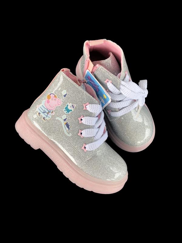 Стильні демісезонні черевики для дівчинки. Є шнурівка та застібка-блискавка. Матеріал - силікон, стійкий до пошкоджень. Всередині текстильна підкладка та м'яка устілка. Підошва - поліуретан. Черевики сріблястого кольору, гарно мерехтять на сонці. Декоровані принтом свинки Пеппи. Підошва має вкраплення рожевого глітера. Зсередини черевички рожевого кольору. Розмір 24, довжина устілки 16 см