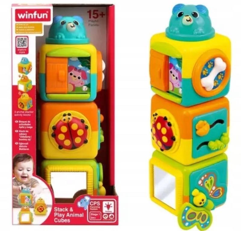 Ігрові блоки серії "WinFun Stage1". Три зручні яскраві блоки для різноманітних ігор - простої побудови башти, пересування віконець, перегортання книжечок, і прокручування круглих кнопок. На кожній стороні блоків - зображення, або рельєфні фігурки різних тварин.