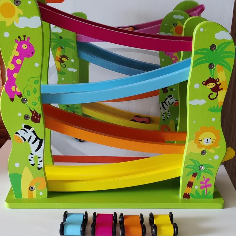 Деревяний автотрек для діток 18м+ чудова гра . 4 машині спускаються одна за одною швидко. Машинки теж в наборі. Є невелике подряпання ,але для гри не заважає.