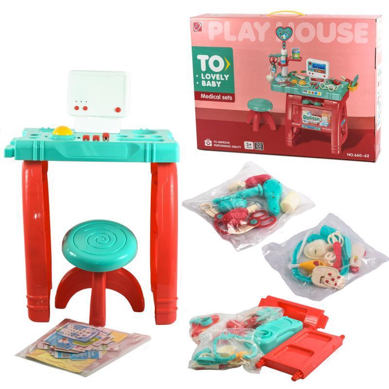 Доктор стіл 55-77-38 см, стільчик, стетоскоп, інструменти, 22 предмета, звук, світло, батарейки ( в комплект не входять). Матеріал : пластик Упакування : коробка.