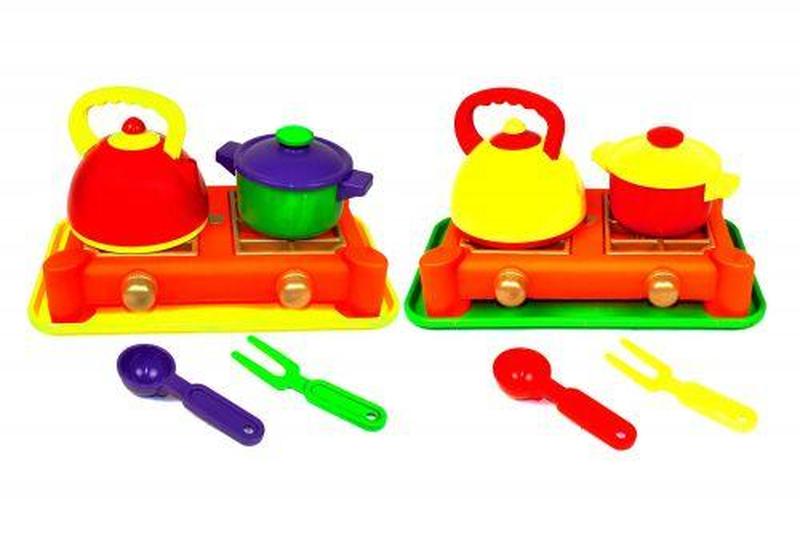 Газовая плита (6 предметов: поднос, плита, чайник, кастрюля, ложка, вилка.). Материал: пластик._ Бренд: Unika Габариты в упаковке: 36 x 20 x 20 см Габариты без упаковки: 36 x 20 x 20 см
