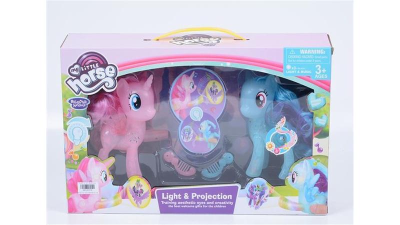 Ігровий набір My little horse із двома поні ігровий набір із фігурками поні дитячі поні іграшки для дівчинки Ваша малеча обожнює історії про чарівних коників поні? Тоді така мила барвиста фігурка точно їй сподобається. У конячки дуже милий вигляд, довга красива грива, яку дівчинка зможе розчесати і укласти. Іграшка допоможе дитині розвивати уяву, креативність і фантазію. Набір складається з двох поні. При натисканні кнопки на задній нозі, передня піднімається і на стіні з'являється зображення поні і звучить музика. У комплект входить: - поні 2 шт, - проектор, - гребінець.
