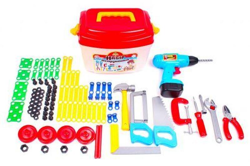 Набір інструментів ТехноК (94 елементи). Велика різноманітність різних інсументів і деталей: молоток, пилочки, викрутки, плоскогубці, дрилі, пластикові планки, куточки, пластини, гвинтики та гайки. Свердло в дриля обертається під час натискання на кнопку (механічне, без батарейок).