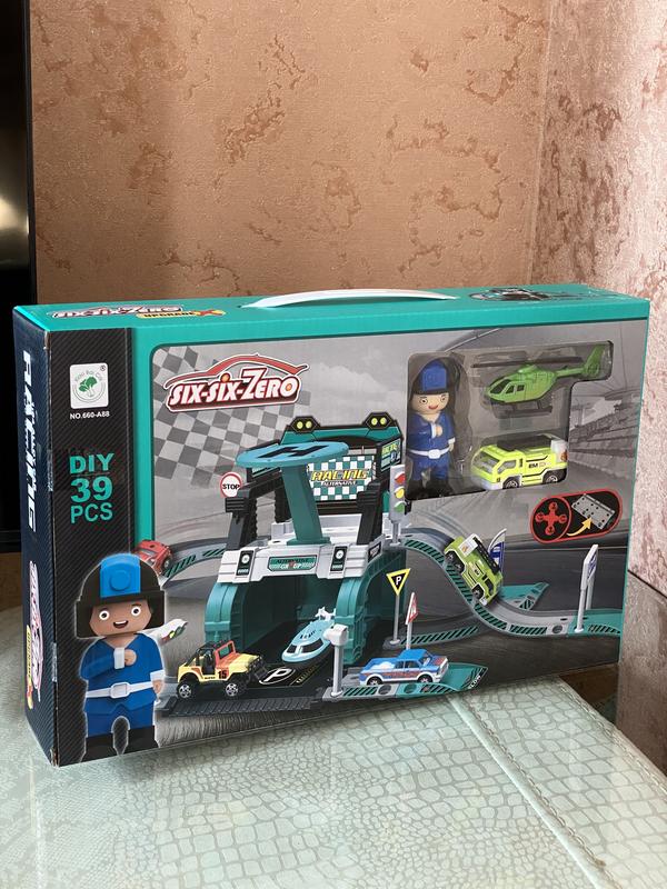 Построй собственный гараж прямо у себя в комнате вместе с паркингом. Оригинальная конструкция гаража, цветовое решение, разнообразные декорации и интересный дизайн сделают игру ребенка более увлекательной. В гараже найдется место не только для машин, выходящих в набор, но и для других моделей из собственной коллекции малыша. Крутые подъемы и спуски и позволят машинкам быстро спускаться. Над вторым этажом располагается площадка для вертолета. В набор входит: детали гаража, наклейки, машинка, вертолет и игровая фигурка ( 9 см ) Гараж изготовлен из пластика, детали машинок из металла с добавлением пластиковых элементов. Позвольте малышу собрать собственную парковку и провести с ней много времени весело и с пользой. Размер упаковки 39-25-8 см