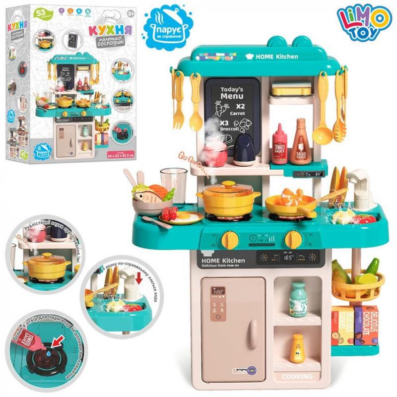 Розмір кухні 63-22-45,5см, мийка-ллється вода(механічно), пара, звук, світло,посуд, продукти, досточка для малювання, крейда, губка, 53 предмети, на батарейках, в коробці 35-49,5-14,5см