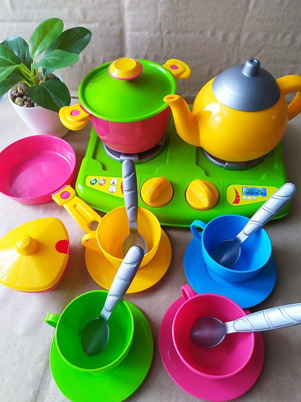 Дитячий ігровий набір посуду, іграшкова "кухня" (плита, чашки, каструля, сковорідка, чайни...
