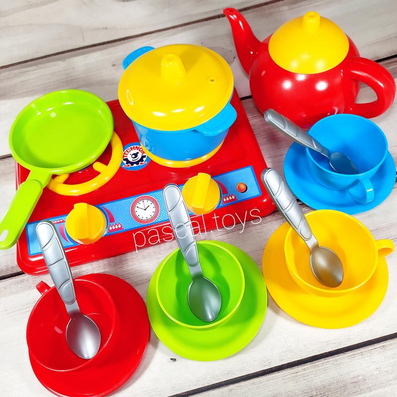 🕯️ Вік: 3+ 🛍️ Комплектація: 📏 Розміри: - плити: 22,2*15,8*4,5 см; - каструлі: 11,7*9*4,8 см; - сковорідки: 16*9,1*1,8 см; - чайника: 16*10*10 см; - чашки: 7,4*6*4,3 см; - тарілки: 9*1 см; - ложки: 10,6*0,8-2,5 см; - упаковки: 22,2*16,5*13 см; 🧰 Матеріал: пластик. 🛠️ Виробник: Технок.