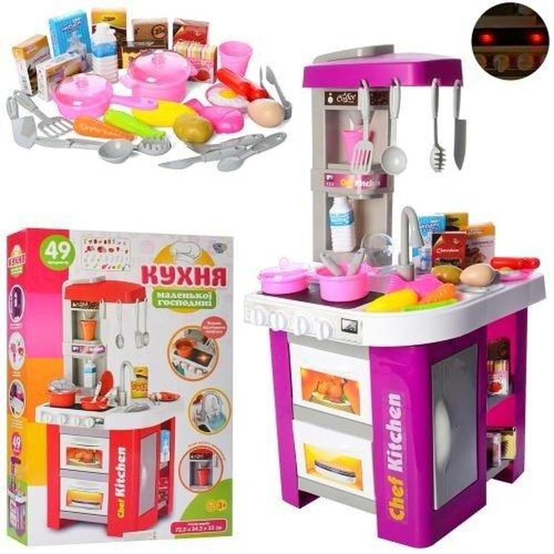 Дитяча ігрова кухня, Kitchen Chef з водою, звукові ефекти, аксесуари,34х72,5х33 см, 922-49 Складається з варильної поверхні з двома конфорками, невеликого столика для оброблення продуктів і мийка з краном. Над плитою -- стійка, що імітує витяжку, на якій є гачки для кухонного начиння, полиці для продуктів і кави машина. Під плитою невелика посудомийна машина та духовка (у обох відчиняються дверцята). Під столиком -- холодильник із трьома поличками, під мийкою дві відкриті полиці, на які можна ставити шухлядки з продуктами. Особливості кухні: - Наявність крана, з якого тече вода. Для цього потрібно в мийку налити води та відкрити кран. Відкривши кран, тече вода, циркулюючи по замкнутому колу. - Іграшка обладнана світловими та звуковими ефектами (підсвітка конфорок, звуки приготування їжі, музика). - У наборі лише 49 різних аксесуарів: деталі для складання кухні, посуд, кухонне начиння, продукти, овочі, фрукти, їжа тощо (звичайно ж, іграшкові) - Кухня виготовлена з міцного, нетоксичного пластику Характеристики: Розмір кухні: 72,5 х 34,5 х 33 см. Розміри плити: 22х 9 см Розміри мийки: 21х10 см. Висота від підлоги до поверхні столу: 40 см. Живлення: батарейки АА 3 шт (до комплекту не входять).