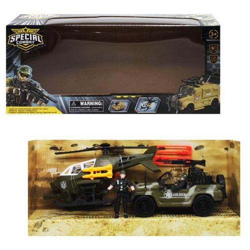 Набір військової техніки. До комплекту входять джип із кулеметом, вертоліт, 2 солдати та 2 ракети. У вертольоті є запускник, за допомогою якого можна стріляти ракетами, натиснувши кнопку. У вертольота також обертається гвинт. За допомогою набору можна побудувати військову сцену або просто весело грати. Все зроблено з високоякісного пластику._