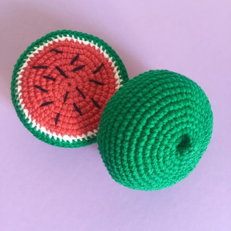В′язана дитяча іграшка "Кавун". Зроблений з природних, натуральних, гіпоалергенних матеріалів. Пряжа: бавовна - 55%, акріл - 45%. Наповнювач: холлофайбер. Іграшка складається з двох половинок. Розміри однієї половинки кавуна: діаметр-6,5 см, висота-3,7 см. Пакування: екологічна, переробна упаковка. Ціна вказана за 1 шт! Мінімальна сума замовлення 300 грн (на цю суму можете вибрати любі продукти, які подобаються)!