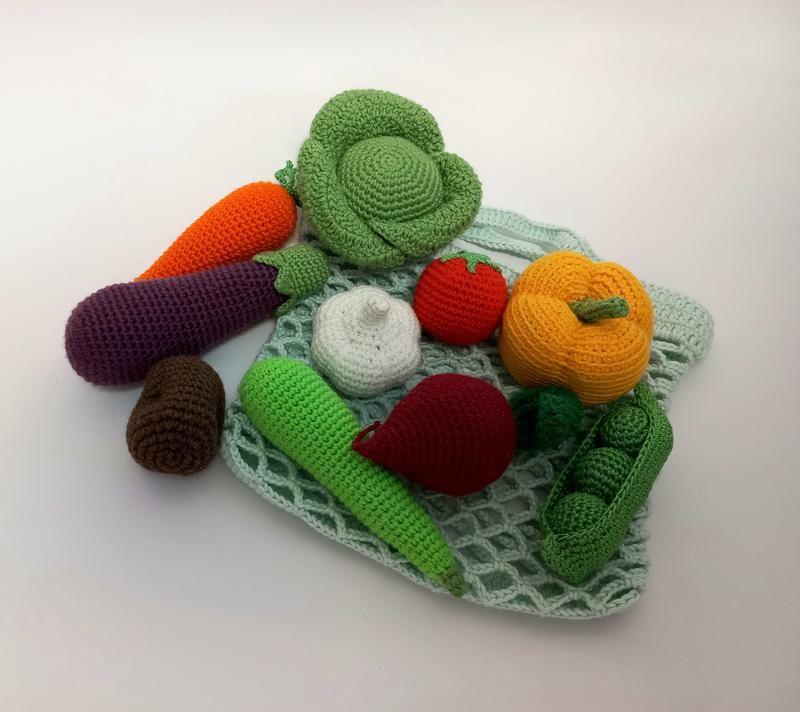 Набір овочів в сітці, пов'язаний з якісної пряжі. В набір входить 10 овочів, що на фото і сітка. - капуста або гарбуз; -картопля; - горох (виймається з стрючка); - морква; - помідор; - перець; - кабачок; - баклажан; - часник; - буряк. Набір овочів в сітці стане відмінним подарунком для маленьких хазяєчок. Всі овочі зв'язавши середнього розміру, що б дитині було зручно тримати в ручках.