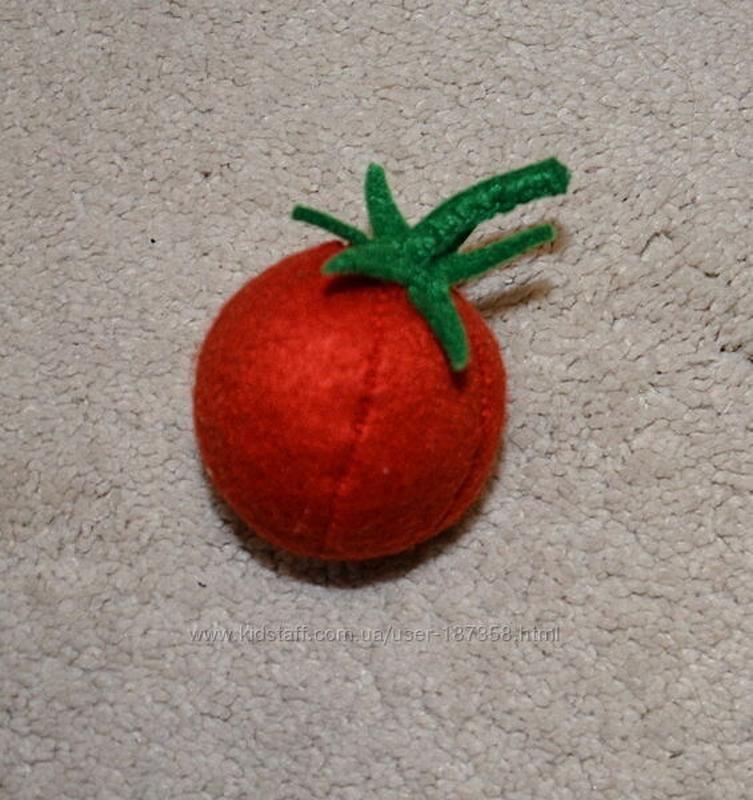 Помідор з фетру. Розмір 7 Х 8 см. Граючи з такими іграшками, дитина розвиває інтерес до кулінарії, вивчає види овочів, вигадує сюжети для рольових ігор та поповнює словниковий запас. Можливо пошиття всіх видів овочів та фруктів, виготовлення набору. Товар виготовляється на замовлення