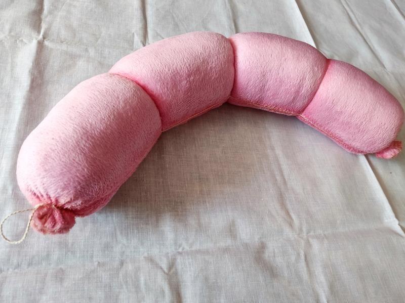 Іграшка ковбаса Дорожня у повному розмірі реального батона вареної ковбаси з ніжного плюшу, перев'язана шнуром відповідно до ГОСТу, тонована фарбами для текстилю. Наповнювач синтепон. Довжина приблизно 60 см, діаметр близько 10 см, обхват 30 см. Кумедний подарунок любителю смакоти або технологу харчового виробництва, а можливо кухареві ☺ Можна використовувати як дорожню подушку або для фотосесії. Поради щодо догляду: делікатне прання для іграшок. Добре просушити після прання перед використанням.