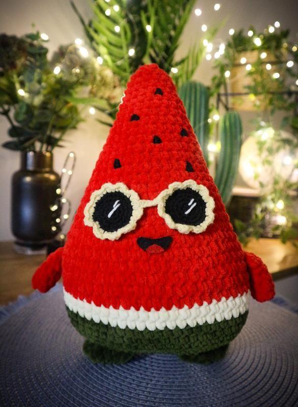 М'яка іграшка 'Кавун' зв'язана гачком із плюшевої пряжі 100% поліестер. Очі вив'язані із пряжі бавовна 55%-акрил 54%. Ротик із фетру закріплений клеєм. Наповнювач холофайбер Висота - 26 см Ширина без ручок - 16 см