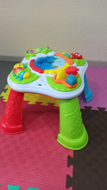 Игровой центр "Sensory Table" — это столик со световыми и музыкальными эффектами, который помогает малышам от 10 месяцев развивать концентрацию внимания, мелкую моторику, тактильные ощущения и координацию движений. особенности: 5 игровых сенсорных зон: -Хамелеон из мягкой ткани, при нажатии активируется звук и свет. -Геометрические фигуры - 3 формы с разной текстурой, которые активируют музыкальные и световые эффекты при попадании в нужное отверстие. -Зееро - касаясь озера рукой ребенок может оставить свой отпечаток и найти прячущихся рыбок. -Солнышко - при нажатии открывает крылья. -Гусеница - 4 кнопки при нажатии воспроизводят музыку и активируют световые эффекты. В отличном состоянии, только немного потертости глаз в хлёстеона