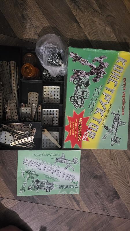 Металевий конструктор #4. Трішки прим'ята коробка( видно на фото. Всі деталі на фото. Чогось їх там більше деяких, ніж вказано на коробці. Аде ми нічого не губили і не докладали. Конструктор металевий №4, упаковка – пластиковий піддон у картонній коробці. У комплекті 147 комплектуючих: деталі конструктора (пластини, плити, куточки, колеса та ін.), інструменти для збирання, гайки, болти. Рекомендований вік – від 6 років. Ширина: 31 Довжина: 30 Висота: 3