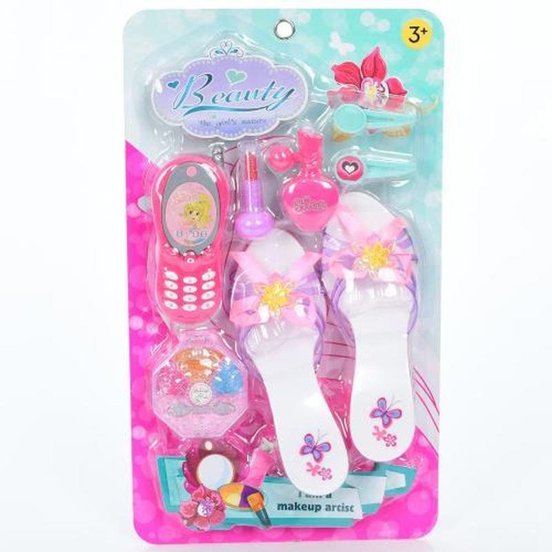 Набір аксесуарів для дівчинки. Комплектація - туфлі, помада, тіні, шпилька, телефон. Є звукові ефекти. Живлення - батарейка типу таблетка. Паковання — лист. Розмір - 22х6х37,5 см.