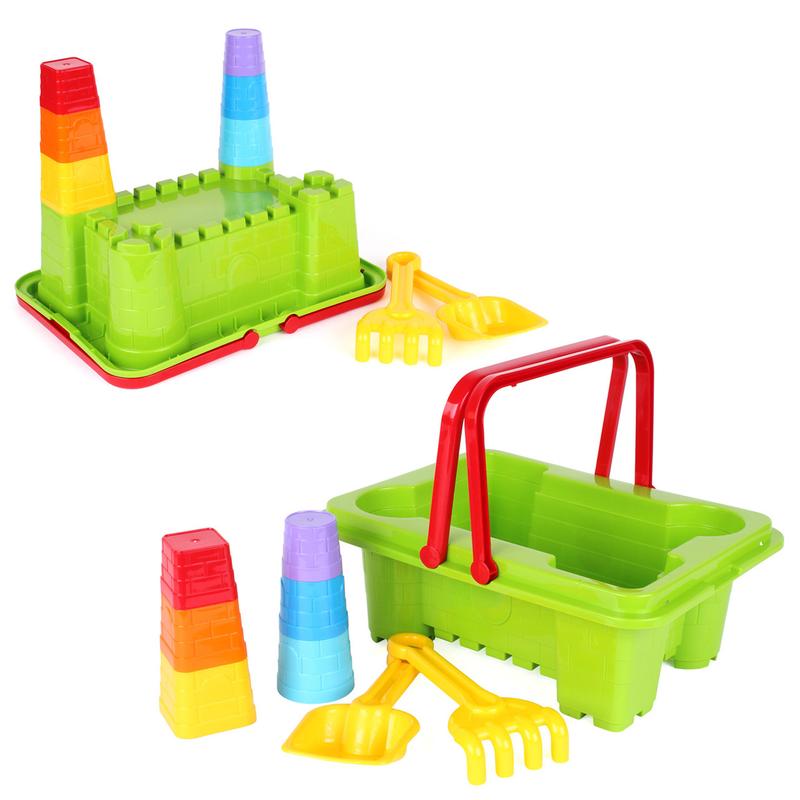 Іграшковий набір "Для гри в піску". Комплектація - набір форм, лопатка, грабельки. Матеріал - пластик. Паковання — кошик. Розмір - 29х16,5х15 см.