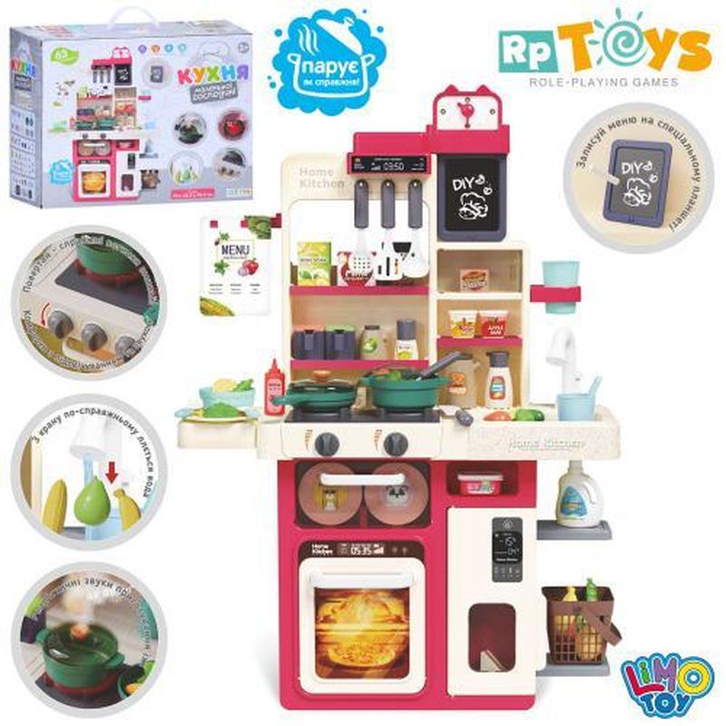 Іграшка "Кухонний модуль", 63 предмети. Розмір - 70х45,5х70,5 см. Комплектація - посуд, продукти, плита, мийка. Ллється вода, є реалістична пара, звуки та підсвічування. Живлення - батарейки. Матеріал - пластик. Паковання — коробка. Розмір - 45х17х36 см.