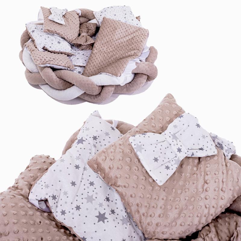 Дитячий постільний набір "Коса". Комплектація - матрасик, ковдра, 4 подушки та бампер для бортиків ліжечка. Матеріал - текстиль, плюш. Паковання — пакет. Розмір - 60х60х20 см.