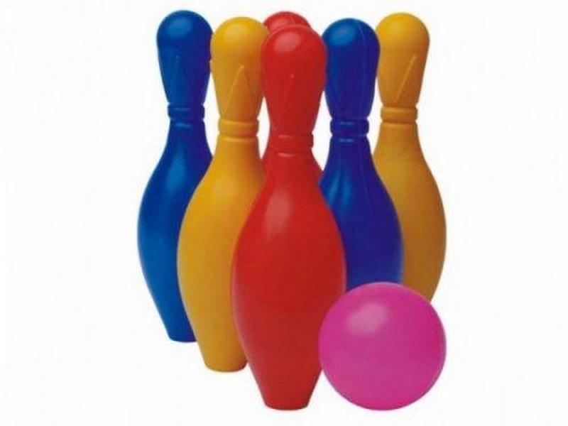 Набір "Кеглі для боулінгу". Набір містить: Кегли — 6 шт., м'ячики — 2 шт. Висота кеглі — 25 см. Діаметр м'ячика — 7 см.