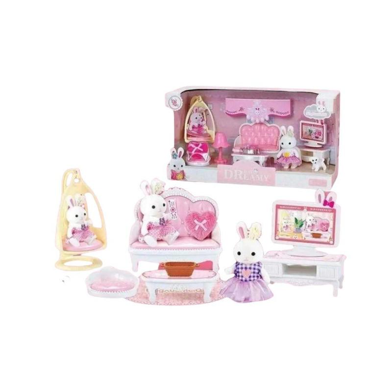 Набор мебели для флоксовых животных – Гостиная – решетка станет еще интереснее с таким набором мебели для любимых животных. Такой набор украсит спальню в доме зверюшек. В комплекте: флоксовый зайчик,диван,тумба с телевизором,столик,пуфик,подвесные качели аксессуары для уюта милой зайки.Рекомендуемый возраст: 4 лет
