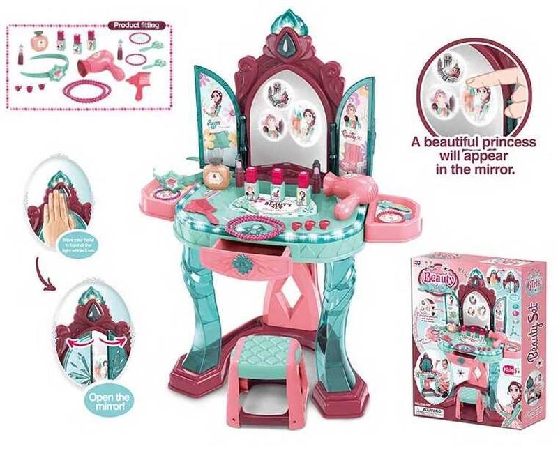 Виключно розкішний дизайн, вдало підібране колірне поєднання, великий набір додаткових ігрових елементів, цікавий функціонал та багато іншого знайде Ваша юна леді в одному подарунковому наборі “Beauty Angel”. Унікальність трюмо полягає у сенсорній кнопці, яка відкриває перед маленькою красунею чарівне люстерко, варто лише піднести долоньку до кришталевого серця. Особливості: - трюмо виготовлене з міцного пластику, який здатен витримати активну експлуатацію та вагу дитини; - виконане у стильному поєднанні кольорів; - має напівпрозорі елементи, які додають іграшці вишуканості та тендітності; - висувний ящик допоможе малечі надійно зберігати маленькі дрібнички; - “родзинкою” трюмо є сенсорна кнопка з підсвічуванням у вигляді серця, яка відкриває і закриває люстерко; - відтворює звукові ефекти; - стільниця по периметру обладнана яскравим підсвічуванням; - у комплекті з трюмо представлений зручний маленький стільчик; - у наборі дитина також знайде цілий комплект для створення неповторних образів: фен, гребінець, намисто, каблучки, обруч та пляшечки, що імітують косметичні засоби; - трюмо працює від 3-х батарейок типу “АА” (не додаються). 008-988)