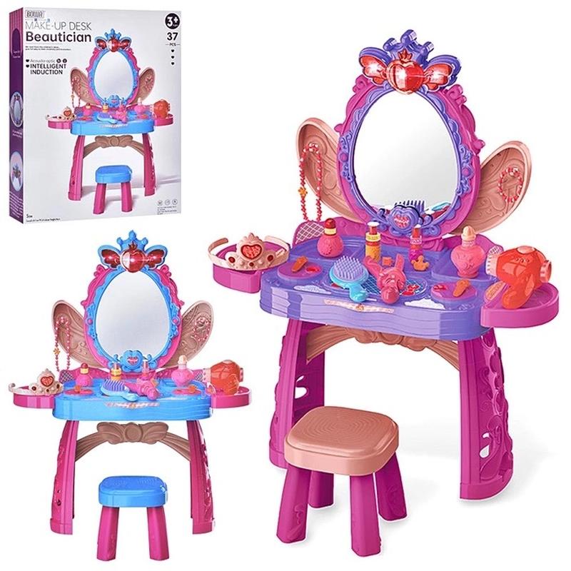 Трюмо/туалетний столик 8224AC/BC муз., світло., на батар., в собр.виді 75*59*27см, з аксесуарів. 37предм. (стульчик, гребінець, фен(батар.), плойка, корона, шпильки, баночки), в коробці 54*42*11см