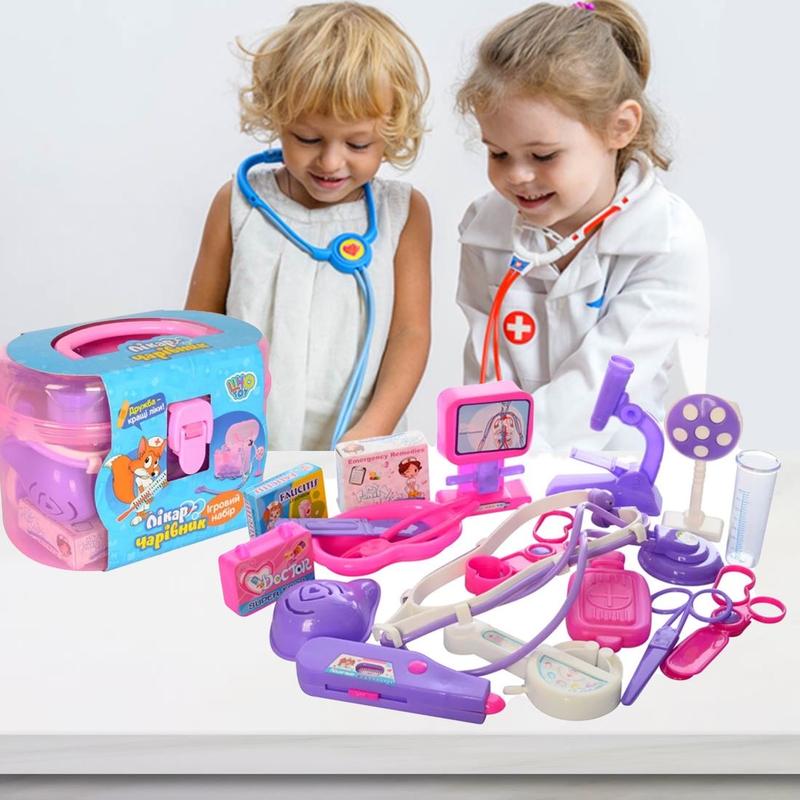 Набор имеет отличную комплектацию: стетоскоп, ножницы, термометр, микроскоп, множество коробочек для лекарств и многое другое. Главное, что все предметы легко вмещаются в практичный кейс, и не занимают много места после игры. Характеристики: Тип: игровой набор Материал: пластик Размер в коробке: 18,5х9,5х12 см Упаковка: пластикова коробка Возрастная группа: от 3 лет Тип: набор юного врача Упаковка: пластикова коробка