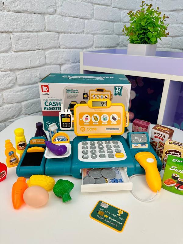 Кассовый аппарат🧮с настоящим калькулятором➗и таблом📺 Кассой наполненной монетами🪙купюрам💵 📞сканер со световыми и звуковыми эффектами 🔊 📟банковский терминал для карты 💳 мини-весы ⚖️ Продукти🍆баночки🥤🍽️деньги 💵и другие тематические аксессуары🍰входят в комплект Два цвета🔵🔴 🔋Работает от 3шт АА (не прилагаются)