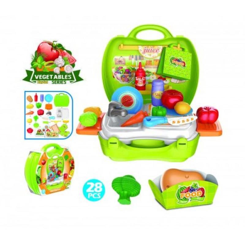 Ігровий набір "Овочі" складається з пластикової валізки з ручкою, яка перетворюється на столик із раковиною та виїмками для посуду. З боків столика містяться полички, а на кришці є гачки та поличка. У комплекті: пакет для продуктів, ніж, 2 тарілки, соломинка, кетчуп, картопелька, кукурудза. морква, 2 помідори, лимон, капуста, броколі та перець.