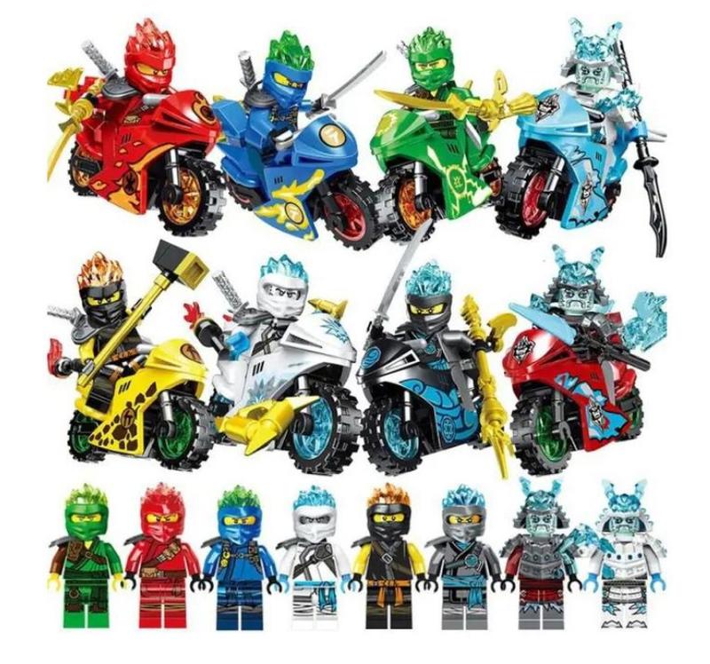 Конструктор фігурки ніндзяго на мотоциклах зі зброєю. Набір складається з 8 героїв та мотоциклів. Всі фігурки аналогові. Є кольорова інструкція. Сумісні з відомим конструктором, що дозволяє створювати безліч цікавих комбінацій та сценаріїв. Виготовлені з якісних матеріалів.