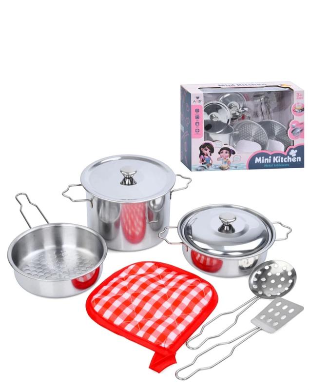 Дитячий набір посуду, наближений до справжнього. Кастрюлі, сковорідка, кухонний набір металевий, прихватка Упаковано у коробці