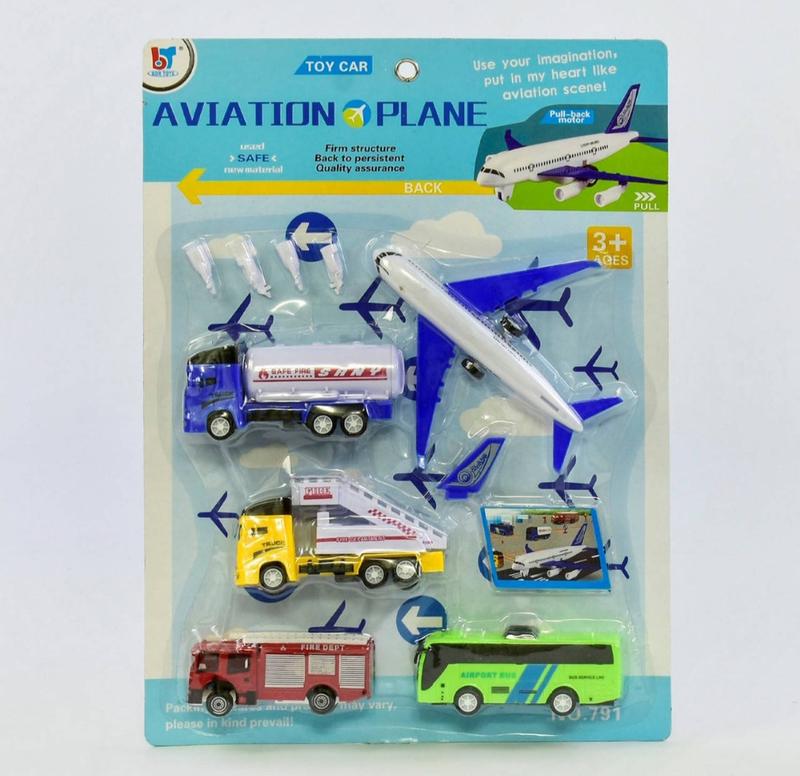 Набір спецтехніки 791 представлений різними видами транспорту, що обслуговує зону аеропорту: літак, автобус, пожежні машини. Іграшки сприяють розвитку координації рухів, фантазії та моторики малюка, надає йому можливість моделювати різні дорожні ситуації та розігрувати побутові сюжети. розмір упаковки 43×32см літак 17см автомобілі 13см