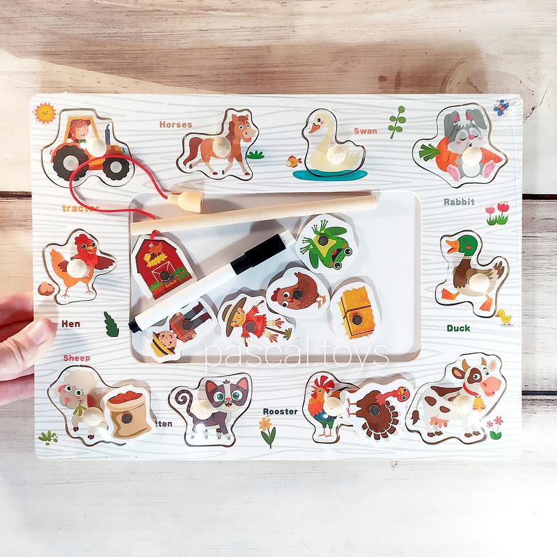 🛍️ Комплектація: 10 вкладишів, 8 фігурок рибалки, вудочка, маркер, дошка-основа. 📏 Розміри: - дошки: 30*22,5*1,5 см; - поля для малювання: 18*10,5 см; - вкладиша: 🐄 корова 6,1*5,4 см, 🐈котик 5,1*4,5 см; 🧰 Матеріал: дерево.