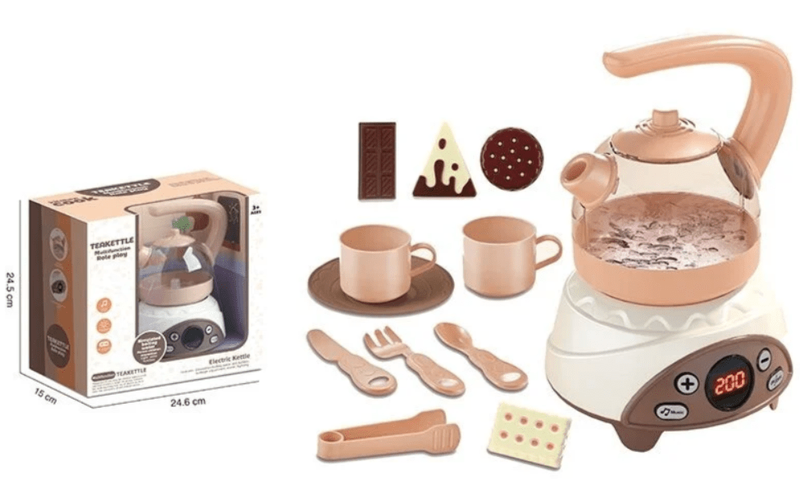 Усе готово для солоденького чаювання, залишається лише ввімкнути чайник, щоб скоріше заварити запашний чай. І це можливо разом з цим іграшковим набором, адже тут є чайник, який може імітувати закипання води, тістечка та необхідний для них посуд. Чайник здивує малечу своїми вміннями — підсвічується, відтворює характерні звуки, а ще має можливість регулювання потужності. З такою іграшкою можна завітати на чаювання навіть до короля Англії! Особливості: - розмір чайника 14х14х21 см; - до чайника додається набір посуду та тістечка; - є імітація кип’ятіння води; - під час роботи чайник підсвічується та відтворює характерні звуки; - також є режим відтворювання веселих мелодій; - світлові та звукові ефекти працюють від 3-х батарейок типу “АА” (не додаються); - іграшка виготовлена з якісного пластику, який є безпечним для здоров’я дитини. Розмір упаковки 24*24*15 см Розмір іграшки 14*14*21 см