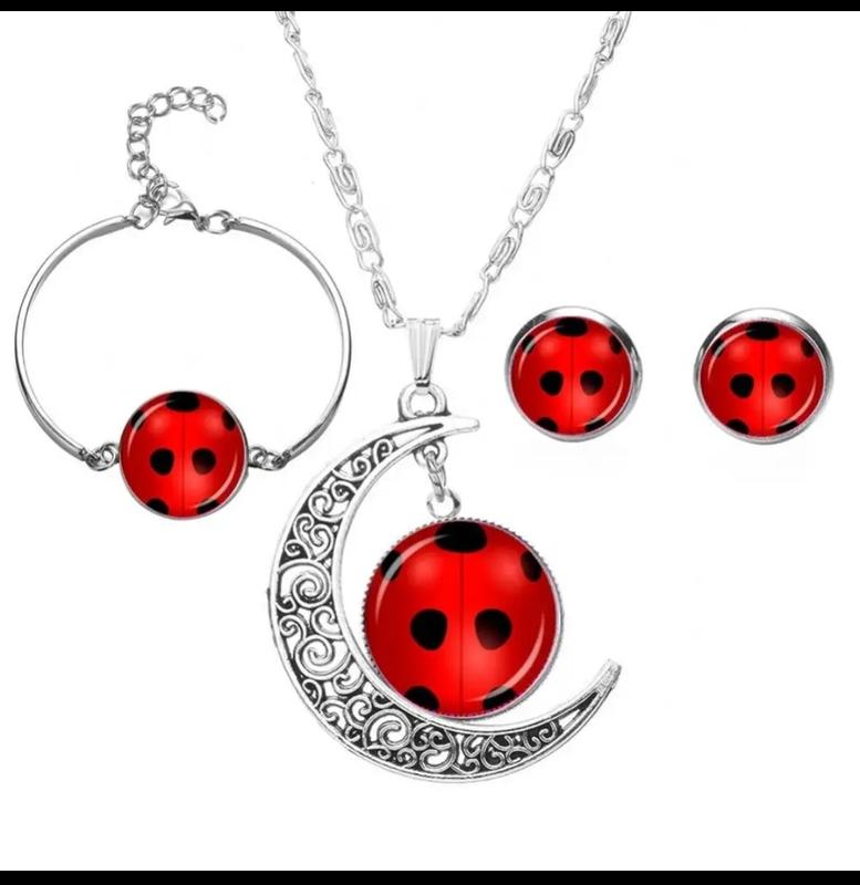 Набір леді баг ледібаг червоний в чорну цяточку кулон браслет сережки кульчики