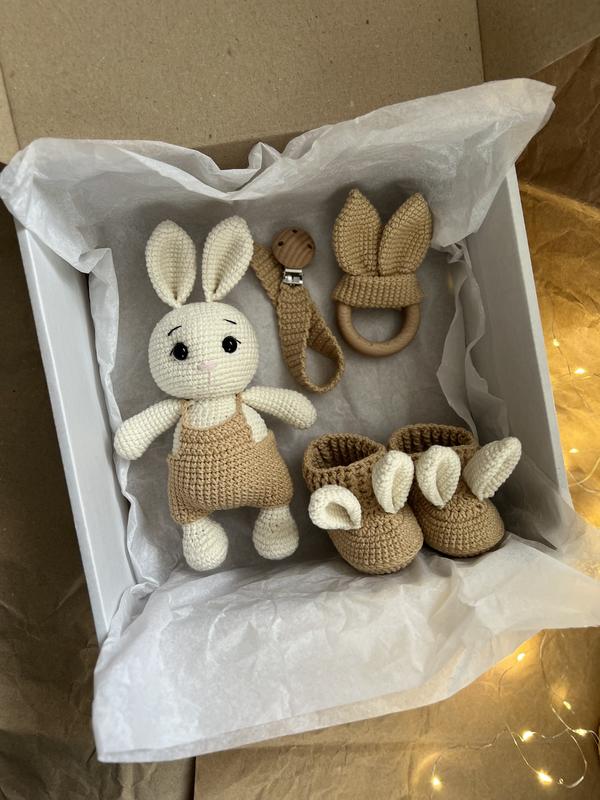 Цей набір - це ніжність яку хочеться подарувати. Чудово підійде як для хлопчика , так і для дівчинки. Крута ідея подарунку на гендер паті, народження чи хрещення малюка. В набір входить: -Іграшка зайченя - пінетки (обираються в залежності від віку дитини) - гризунець вушка (вушка при доторку шуршать) - тримач для пустушки Вартість набору 1 450 Склад набору можна змінювати, або можемо змінити кольорову гаму Пишіть в повідомлення і ми підберемо той самий набір🤍