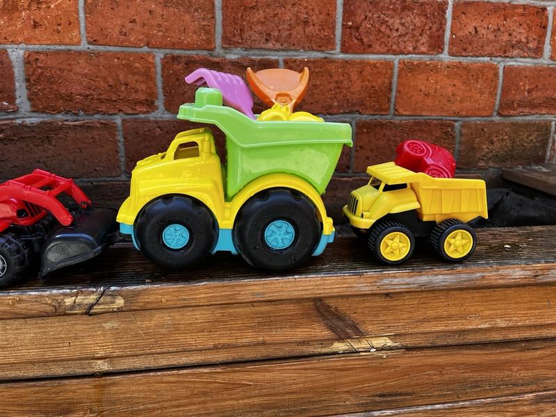 В доброму стані машинки 3шт та трактор, лопатка, грабля та формочки для піску. Продаж набором але можливо і окремо .