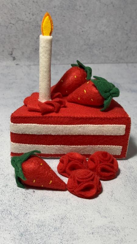 Є 10 різних шматочків торту,можна переглянути у мене в оголошенні.Довжина цього шматочка 12 см.Всі деталі знімаються Також можу зробити по фото будь-який інший торт,цілий чи з різними шматочками.Орієнтовно час виготовлення 1-2 дні