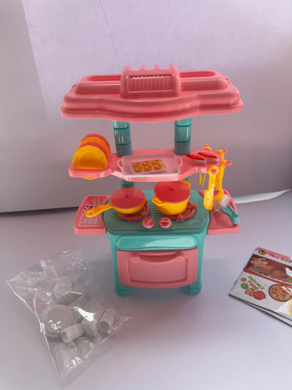 Дитяча кухня Це яскрава дитяча іграшкова кухня для сюжетно-рольових ігор. Вона складається з плити з духовкою, варильної поверхні з каструлями та сковорідкою, мийки, полиць і набору кухонного посуду. Верхня поличка вміщає тарілки, піднос з іграшковими яйцями, а також гачки для кухонного приладдя (лопатки, черпаки). До комплекту входить безліч аксесуарів: тарілки, чашки, каструлі, упаковки продуктів, а також наліпки для прикраси кухні. Кольорова гама — переважно рожевий, бірюзовий і жовтий. Ця іграшка чудово підходить для розвитку уяви, дрібної моторики та знайомства з побутовими предметами.