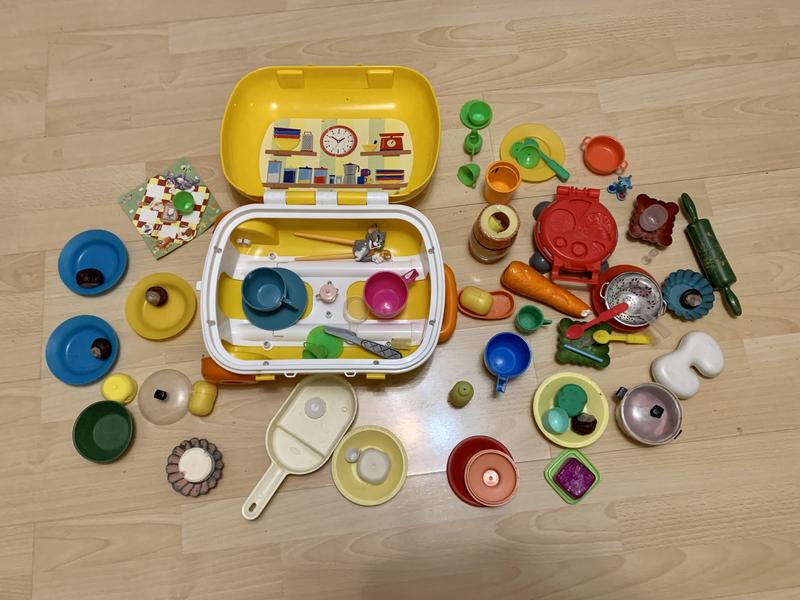 Набор дитячого посуду. Чемоданчик, тарелки, чашки, формочки-залишились від різних наборів, багато всього для дитячої фантазії. Самовивіз-м.Київ пр-т В.Івасюка б.14 Пересилка-нова пошта, укрпошта, розетка.