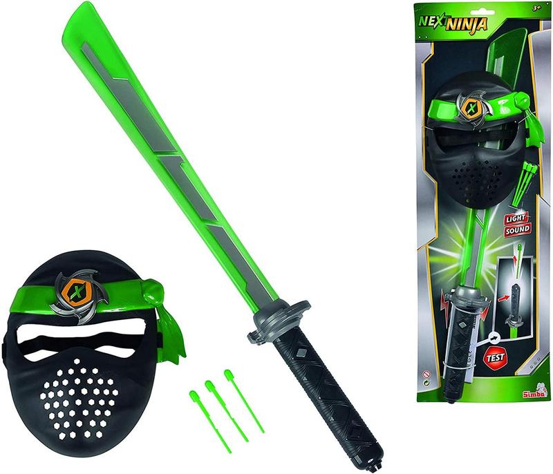 Ігровий набір зброї Некст Ніндзя з мечем зі звук. та світл. ефектом Simba 8042238 З набором Некст Ніндзя, що складається з меча та маски, діти можуть грати роль справжніх ніндзя. Великий меч довжиною 60 см, при натисканні верхньої кнопки має світлові і звукові ефекти. Якщо натиснути кнопку на ручці знизу, дротики вилітають з рукоятки. Маска з поролоном навколо очей на внутрішній стороні, кріпиться до голови текстильною резинкою. Меч Некст Ніндзя і маска від Simba Toys підходять для дітей від 3-х років.