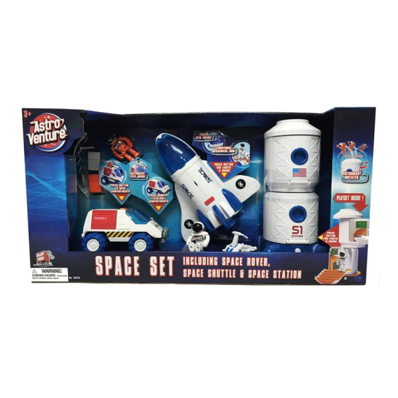 Игровой набор Astro venture Космический набор станет отличным подарком для ребенка, увлекающегося темой космоса. Вперед к приключениям! Станция оснащена звуковыми и световыми эффектами, состоит из двух комнат и имеет подвижные детали. У космического шаттла открывается отсек, куда можно посадить фигурку. Планетоход имеет свободный ход колес. В наборе: планетоход; станция; шатл; 2 астронавта. Изготовлено из качественного пластика и металла. Питание: 2 батарейки типа ААА, 2 батарейки типа АА (имеется в комплекте). Рекомендовано для детей от 3-х лет. Материал Пластик Цвет Белый Ширина 120 мм Длина 450 мм Высота 290 мм