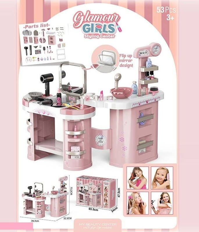 Хочете здивувати свою маленьку красую? Це трюмо точно впорається з цим не простим завданням! У комплекті є все, щоб відчути себе справжньою зірочкою: фен та стайлер з ефектами, дзеркальце, гребінці, аксесуари та імітація косметики. Трюмо допомагає розвивати фантазію, креативність та відчуття стилю. Особливості: - розміри трюмо: 71х32,5х73,5 см; - фен працює від 3-х батарейок типу “ААА” (не додано до комплекту); - стайлер працює від 2-х батарейок типу “ААА” (не додано до комплекту); - стайлер відтворює звук та підсвічується; - фен відтворює звуки, імітуючи роботу фену; - до комплекту додано імітацію косметики, гребінець та інші аксесуари; - дзеркальце; - виконано з пластику.