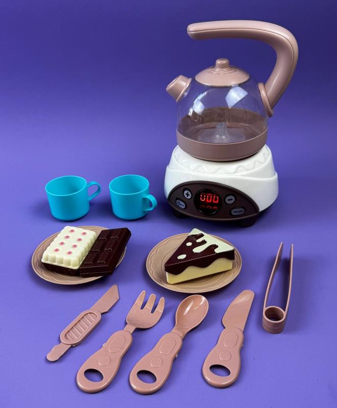 Усе готово для солоденького чаювання, залишається лише ввімкнути чайник, щоб скоріше заварити запашний чай. І це можливо разом з цим іграшковим набором, адже тут є чайник, який може імітувати закипання води, тістечка та необхідний для них посуд. Чайник здивує малечу своїми вміннями -- підсвічується, відтворює характерні звуки, а ще має можливість регулювання потужності. З такою іграшкою можна завітати на чаювання навіть до короля Англії! Особливості: - розмір чайника 14х14х21 см; - до чайника додається набір посуду та тістечка; - є імітація кип'ятіння води; - під час роботи чайник підсвічується та відтворює характерні звуки; - також є режим відтворювання веселих мелодій; - світлові та звукові ефекти працюють від 3-х батарейок типу "АА" (не додаються); - іграшка виготовлена з якісного пластику, який є безпечним для здоров'я дитини. * Характеристики та комплектація товару можуть змінюватися виробником без повідомлення