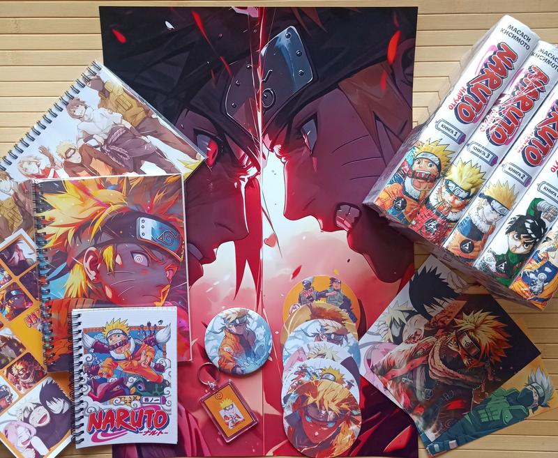 До набору входить: постер А3+ скетчбук на 30 аркушів зошит на пружині в клітинку 48 аркушів блокнот на пружині листівки 3 шт значок 7,5 см брелок стікерпак А5 набір стікерів 6 шт Манга Naruto том з 1 по 5 (тверда обкладинка рос мова)