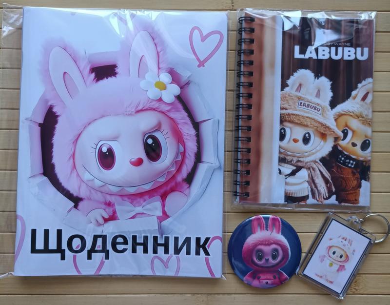 До набору входить: значок 5,6 см брелок щоденник блокнот на пружині Лабубу - це милий монстр, який може бути і кумедним, і трохи бешкетним, і навіть злегка загадковим. Лабубу своїм виглядом нагадує поєднання казкового чудовиська та кролика. І саме своїм унікальним виглядом приваблює людей. Вона має великі очі і гострі зуби, які помітні в широкій усмішці.
