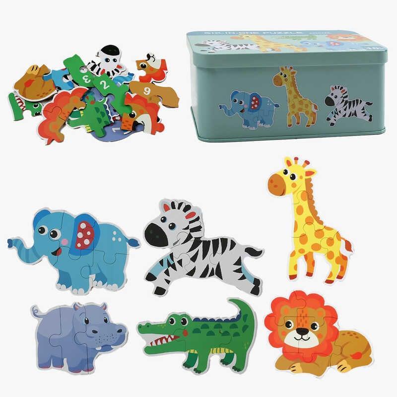 Розвиваючі дерев’яні пазли з тваринами Ці дерев’яні пазли C 73874 — ідеальна іграшка для розвитку логіки та моторики дитини. У комплекті шість яскравих тварин, кожна з яких складається з кількох зручних для маленьких ручок елементів. Зворотній бік пазлів має цифри- підказки, що допомагають у складанні. - Виготовлено з міцного дерева - Шість різних тварин у наборі - Цифри-підказки для полегшення складання - Компактний металевий бокс для зберігання - Розвиває увагу, координацію та посидючість